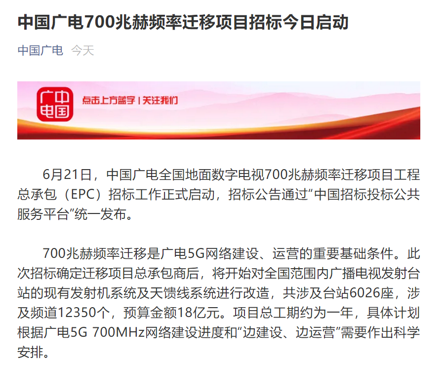 6月21日,中国广电全国地面数字电视700兆赫频率迁移项目工程总承包(EPC)招标工作正式启动,招标公告通过“中国招标投标公共服务平台”统一发布。